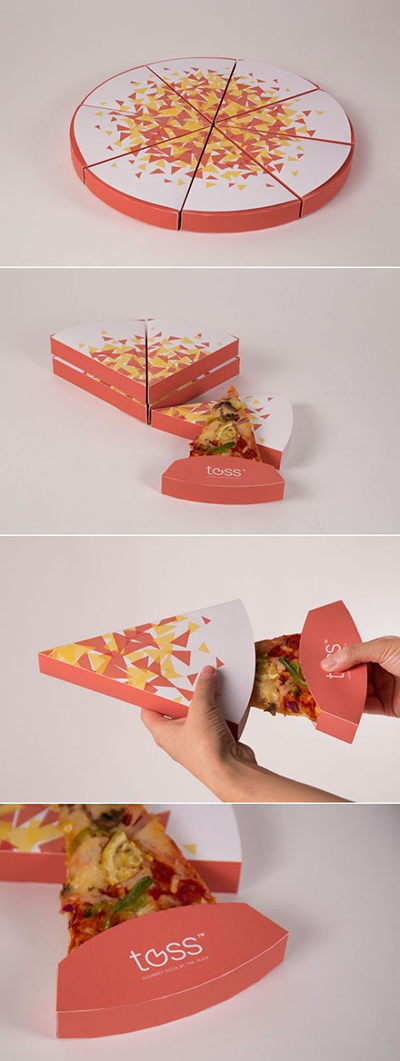 ? ? ? 我們?cè)诔耘_的時(shí)候常常需要用手直接拿,既不衛(wèi)生也不方便,下面這款食品包裝設(shè)計(jì)將每一款披薩進(jìn)行獨(dú)立包裝,上下部分都是卡紙包裝,不僅解決了拿取的問題,還非常適合與同事、朋友、家人一起分享。