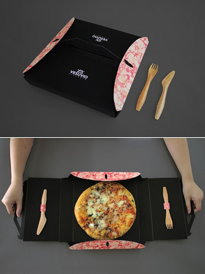 ? ? ? 這一款是外帶披薩包裝盒,折疊紙盒可以節(jié)省空間、方便攜帶和處理,兩邊內(nèi)側(cè)固定了刀和叉,這樣就不會(huì)輕易弄丟了。